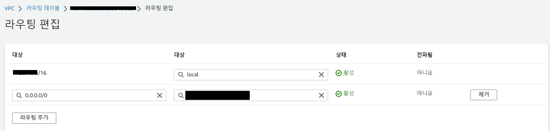 대상이 local인 라우팅 하나만 있을 겁니다. 라우팅 추가 버튼을 클릭하고