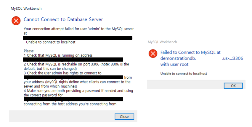 하지만 저는 저 2가지 설정을 아무리 해줘도 워크벤치에서 접속이 안되는 에러가 발생했습니다.