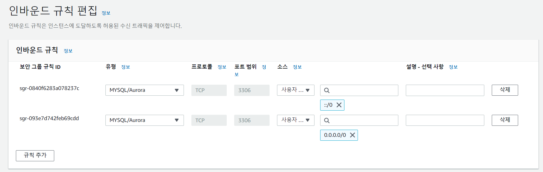 연습용이기 때문에 Anywhere-IPv4, Anywhere-IPv6 소스를 모두 열었습니다.