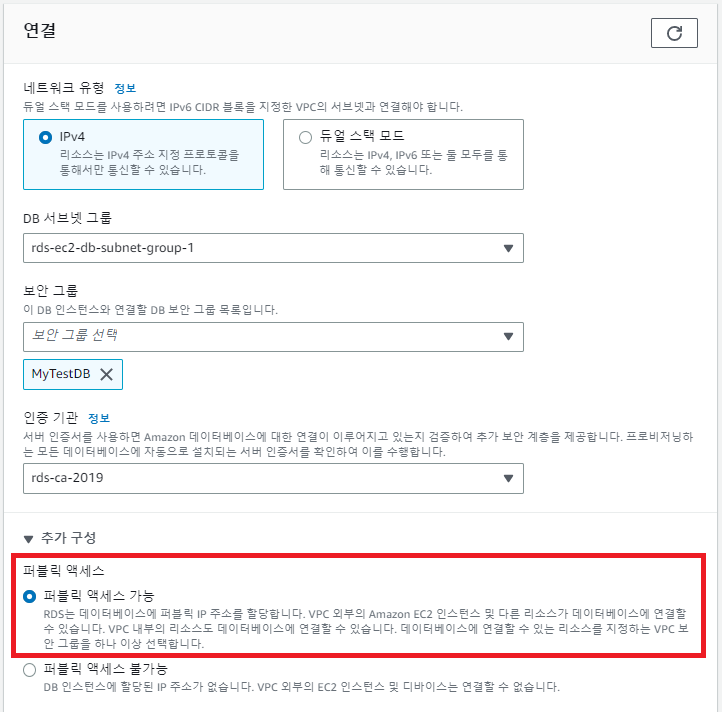 RDS를 생성할 때 퍼블릭 엑세스를 허용해야합니다.