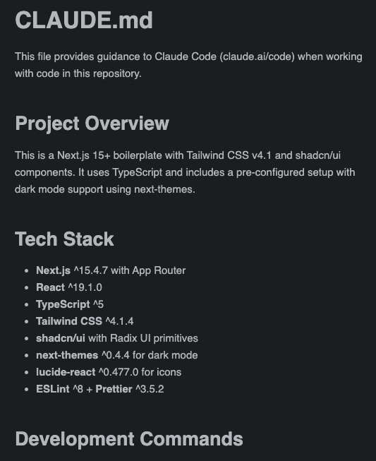 프롬프트 예시) 프로젝트 분석해서 CLAUDE.md 생성. package.json 및 주요 컴포넌트 참고해서 기술 스택, 프로젝트 구조 포함